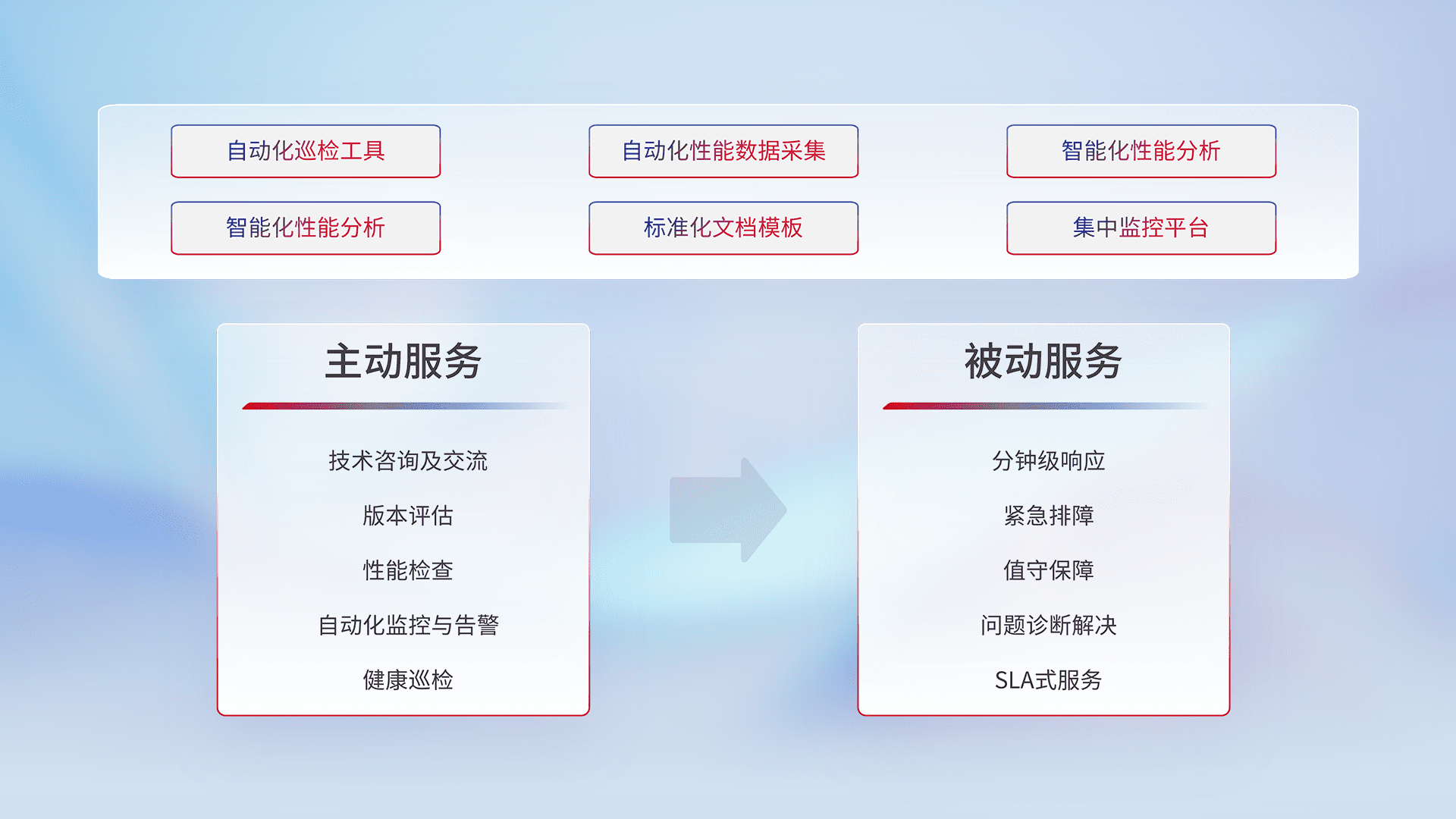 智能化工具和标准化文档,,,保障服务质量,,提供主动服务(包含技术咨询、、、、版本评估、、性能检查、、、自动化监控与告警、、、健康巡检)和被动服务包含(分钟级响应、、、紧急排障、、、、值守保障、、、问题诊断解决、、SLA服务)。。